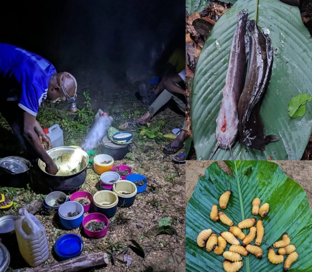 Accompagner une équipe d’inventaire en forêt est une bonne occasion de découvrir la gastronomie locale ! Outre le riz-spaghetti du petit-déjeuner et la traditionnelle soupe de poisson à la pâte d’arachide accompagnée de foufou de manioc (au menu tous les soirs !), les gestionnaires de projet Nature+ ont le plaisir de déguster du poisson frais, des vers de palmier, différentes espèces de champignons récoltés en forêt, des « asperges » sauvages (Lacosperma secondiflorum) cuites sur la braise et du café aromatisé à la citronnelle. De vrais délices !